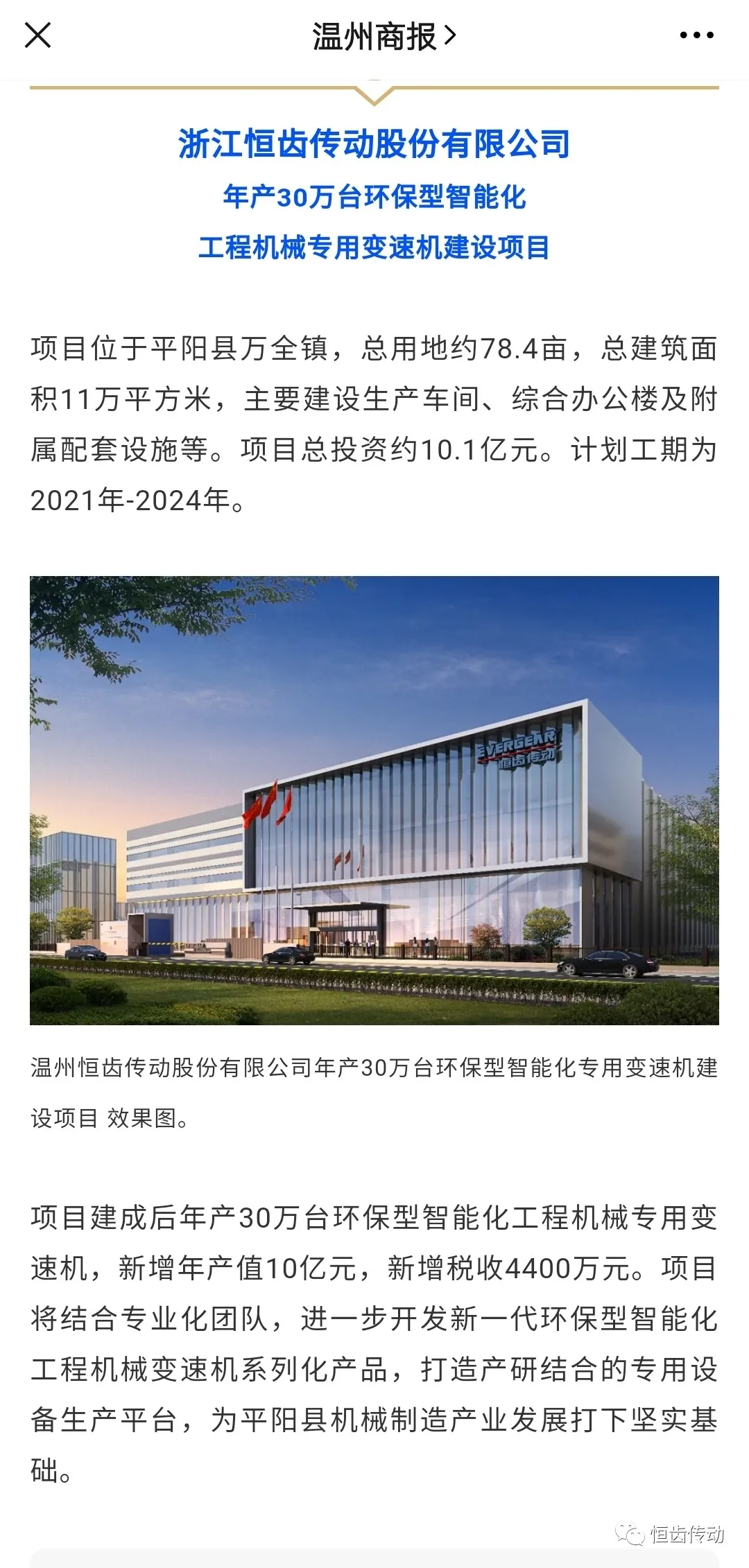 大動作|恒齒傳動年產30萬臺環保型智能化工程機械專用變速機建設項目被納入省擴大有效投資重大項目